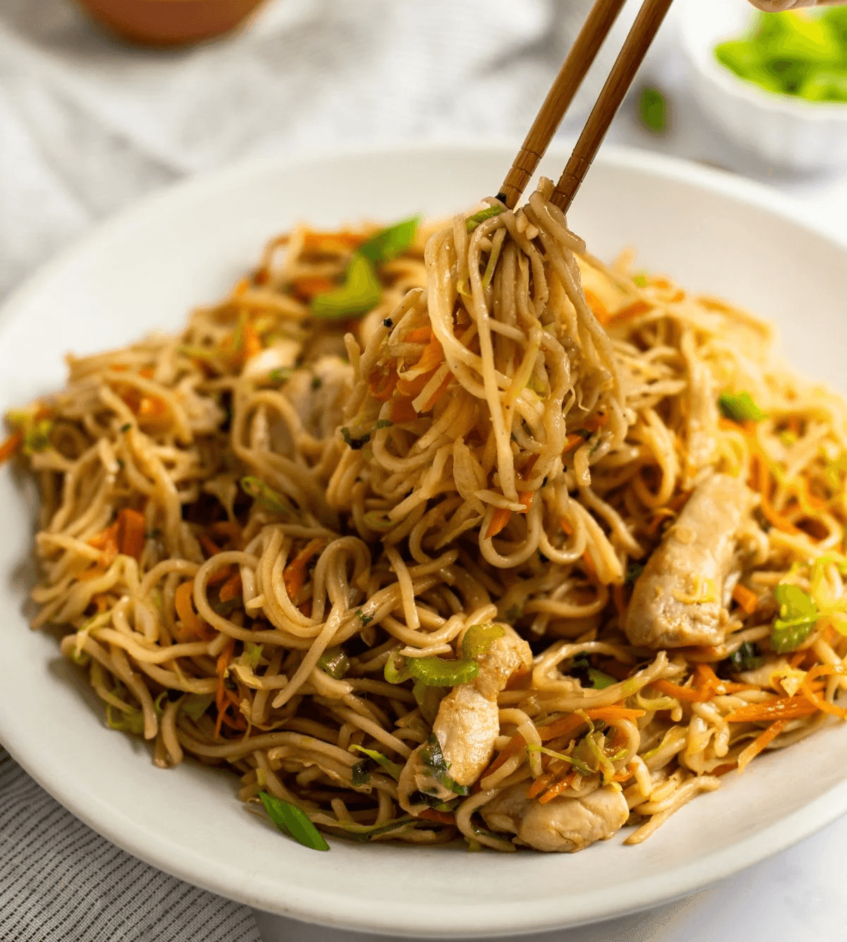 . Stir-fried noodles with juicy chicken