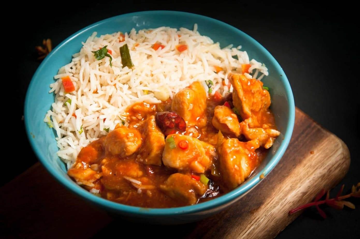 Enjoy our Chicken Manchurian with Rice, featuring crispy fried chicken tossed in a spicy,