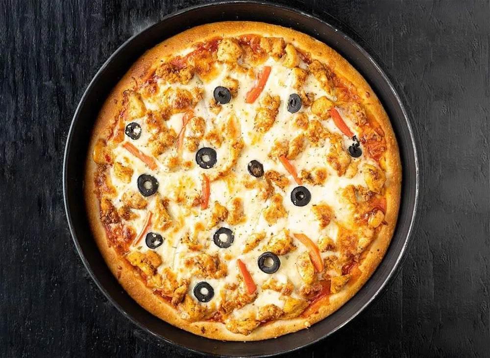 Savor the creamy and spicy flavors of malai boti chicken atop a cheesy pizza base, offering a