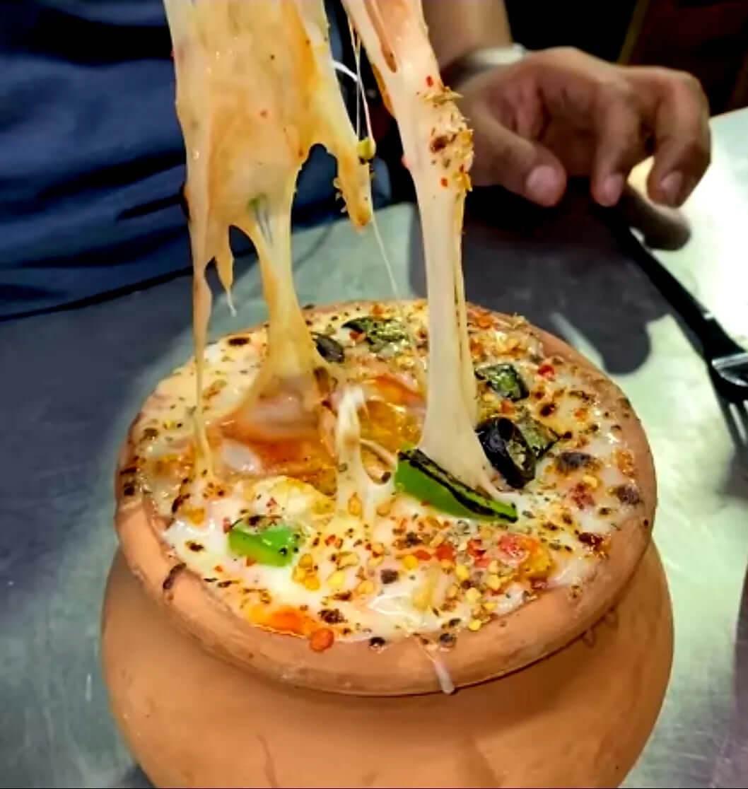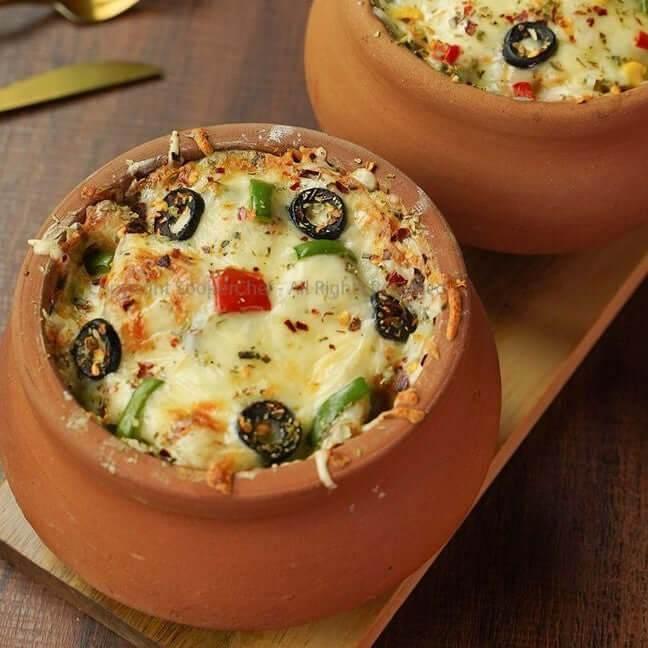 A unique presentation of pizza served in a traditional clay pot, combining rich flavors with a rustic touch.